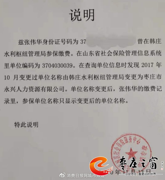 2017年10月17日張偉華的社保由國有全資韓莊水利樞紐管理局變更為棗莊市永興人力資源有限公司。讓張偉華不能理解的是自己怎么從國有全資的國有公司變更到民營公司。