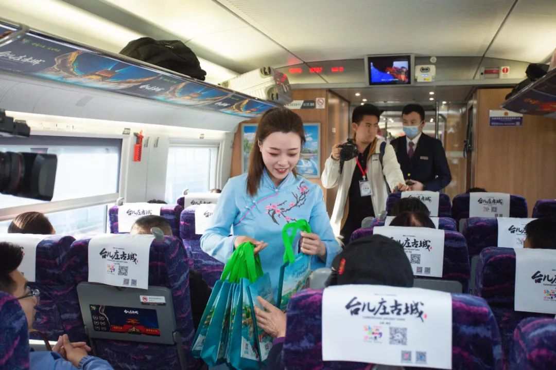 隨后,出席嘉賓共同為“臺(tái)兒莊古城”高鐵冠名專列首發(fā)啟程進(jìn)行剪彩并互贈(zèng)紀(jì)念品。